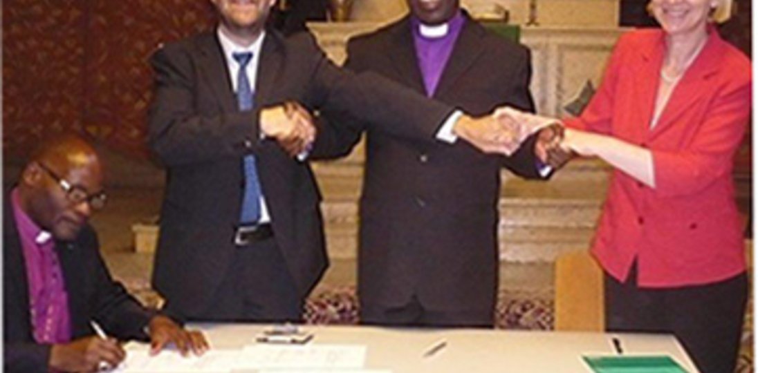 Höhepunkt der Feierlichkeiten war die Unterzeichnung einer Vereinbarung, in der die Zusammenarbeit von Berliner Missionswerk, Botswana-Diözese und Kalahari-Förderkreis geregelt ist. In einem festlichen Akt setzten Afrikareferent Dr. Reinhard Kees für das Berliner Missionswerk, Bischof Jakob Lebaleng Selwane für die Botswana-Diözese der ELCSA und Pfarrerin Elke Unterdörfel für die Osterkirchengemeinde ihre Unterschriften unter das Dokument. Als Zeuge fungierte Bischof Israel Peter Mwakyolile aus Tansania.