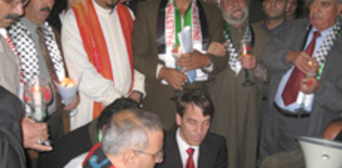 "Zwischen 2000 und 3000 Menschen waren auf palästinensischer Seite unterwegs: mit Kerzen, Gesang und Gebet für den Frieden; es marschierten gemeinsam Christen, Muslime und Israelis. Es verlief - zwar unter großem Aufgebot von Sicherheitskräften - alles sehr friedlich und ohne Zwischenfälle. Unmittelbar vor der Mauer in Bethlehem, am Checkpoint, sprachen Jadallah Shihadeh, Pfarrer der Ev.-Luth.Gemeinde in Beit Jala (Nachbarort von Bethlehem), der Oberbürgermeister von Jena, Dr. Albrecht Schröter, sowie Bischöfin Maria Jepsen Friedensgebete. Hinzu kamen (ungeplant) der Vertreter des Oberrabinates von Jerusalem, Rabbiner Ashermann, und der alte Scheich Frarjeh, ebenfalls mit engagierten Friedensgebeten.