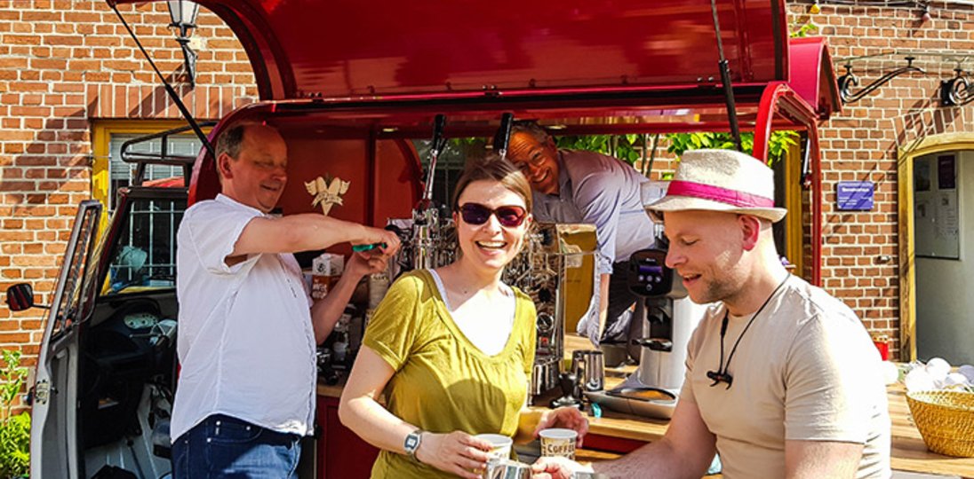 Ziel des Projektes ist es, in Gelassenheit, Gesprächsbereitschaft und Auskunftsfähigkeit auf öffentlichen Plätzen vorbeigehenden Menschen atmosphärisch aufgeschlossen und hörend zur Verfügung zu stehen. Ein guter Kaffee an der hierfür umgebauten „Gastro Ape“ ist ebenso ein Verweilpunkt wie auch Segens- und Bibelworte an der gespannten Wäscheleine zum Auslosen über das aufgestellte „Glücksrad“ - freies Getränk und freies Gespräch. An der roten „Kaffee-Ape“ kann es vom Small Talk bis zu Lebens- und Alltagsfragen oder Gemeinde- und Kirchenfragen um genau das gehen, was die Menschen bewegt. Um Projektleiterin Michaela Fröhling hat sich ein Kernteam zusammengefunden – Amet Bick, Katrin Covic, Alexander Höner und Holger Müller-Brandes – das gerne auch in ihre Gemeinde, in ihren Kirchenkreis und auf ihren Platz kommt. Sie erreichen Pfarrerin Michaela Fröhling mit allen (An)Fragen zu "Kirche Piazza" am besten per Mail unter <link>m.froehling@bmw.ekbo.de.