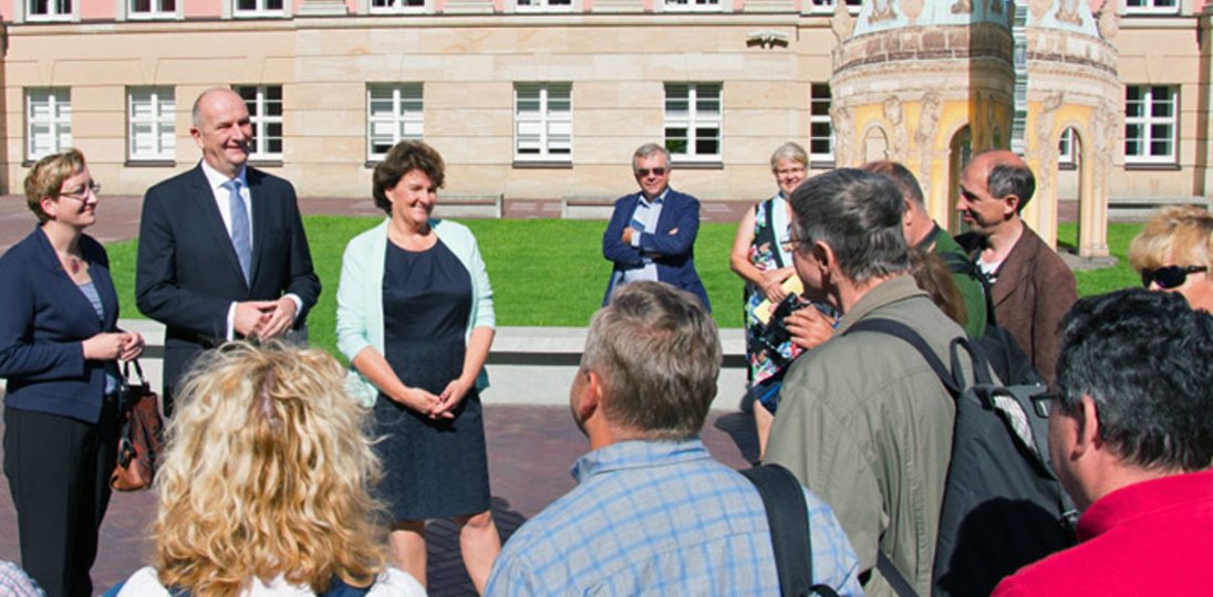 Auf dem Weg zu Fuß, gelegentlich auch mit dem Bus, wechseln zwischen dem 23. und 30. Juni Wandern, Wegandachten und Singen in beiden Sprachen ab. Nach der Begrüßung im Innenhof des Landtags nehmen die Pilgerinnen und Pilger an der Plenarsitzung sowie einer Führung durch das Gebäude teil.