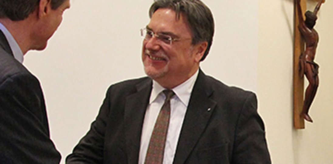 Roland Herpich begrüßt den Kirchenpräsidenten Anhalts, Joachim Liebig (re.), auf der letzten Sitzung des Missionsrats im November.